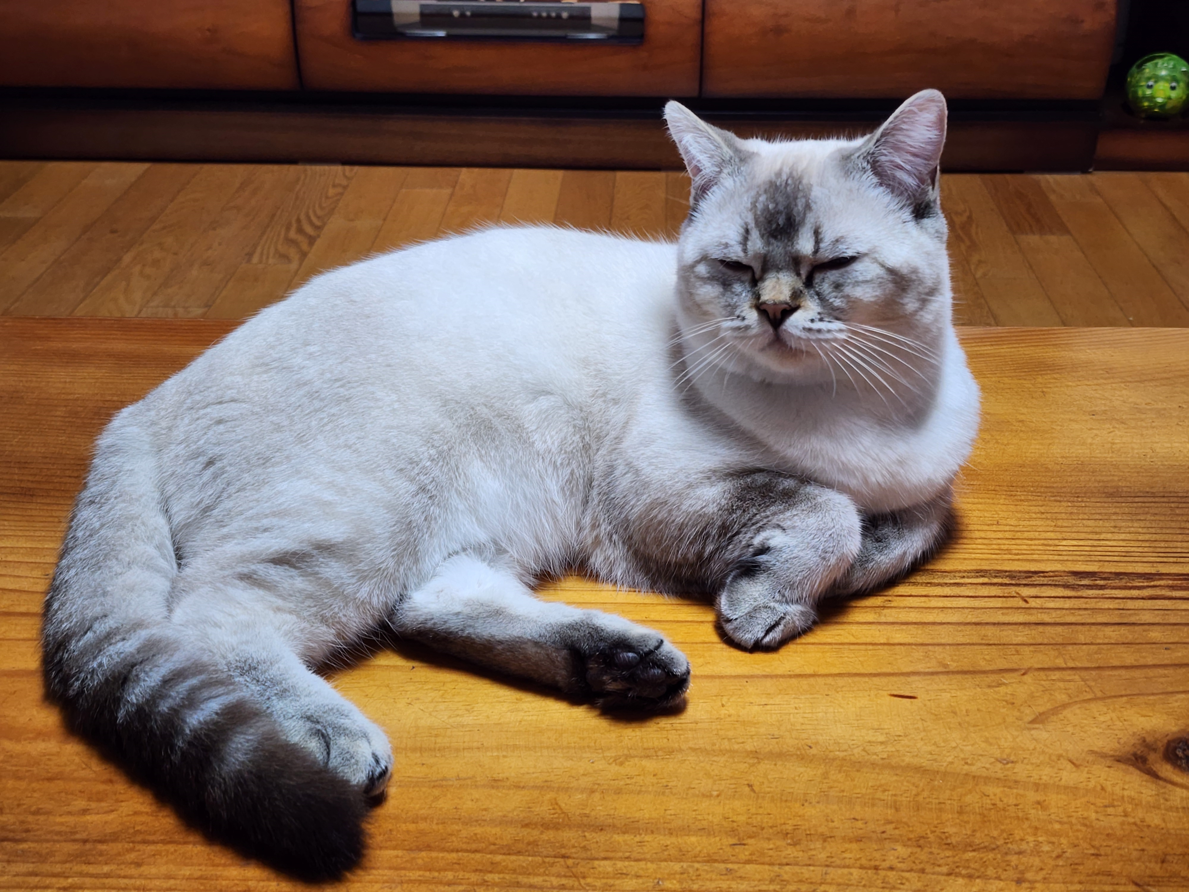 고양이가 바닥에 누워 배를 발라당 뒤집는 것은 최고의 신뢰를 의미합니다.